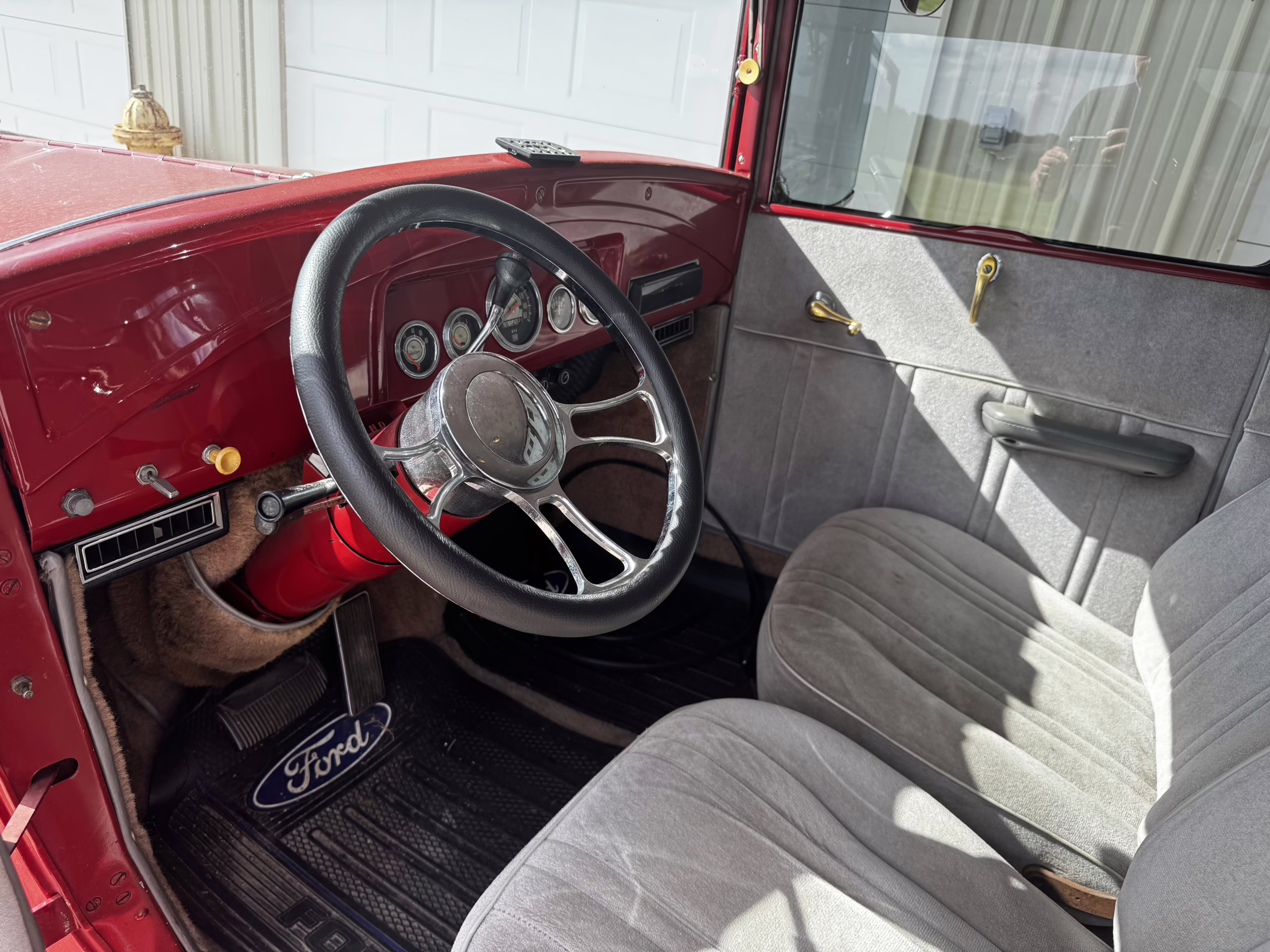 Under the hood, a Ford 302 V8 provides reliable power, paired to a smooth C4 automatic transmission and a stout 9-inch Ford rear end. Suspension is upgraded with a Mustang II front setup and a traditional leaf-spring rear, giving it a balanced stance and drivability. Braking comes from classic drum brakes, keeping with its period feel, while five-spoke American Racing wheels add a timeless hot rod touch.