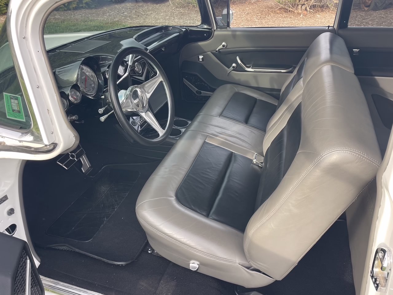 Inside, the car features a beautifully executed Ray Miller custom interior finished in black and gray leather. The cabin includes full custom door panels, a front center console, custom gauges, billet steering wheel, and power windows. A high-end audio system with backup camera brings modern convenience, while the finished trunk reflects the same attention to detail found throughout the build.