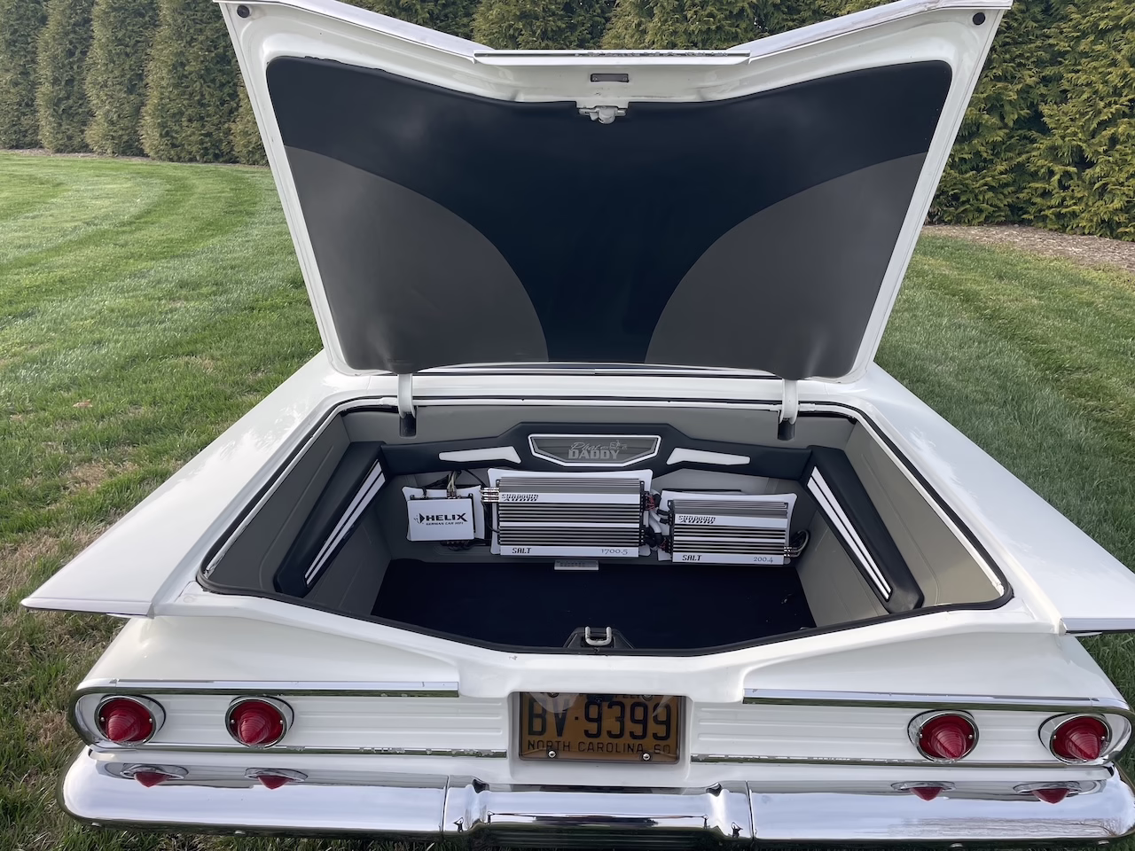 Finished in slick white paint, the body presents beautifully with straight panels, excellent fit and finish, and bright chrome and trim that complement the car’s classic lines. Tinted glass adds a subtle modern touch, while the car’s aggressive stance gives it a commanding presence. It rides on a staggered set of Intro Matrix wheels measuring 20 inches in the front and 22 inches in the rear, wrapped in performance Pirelli tires that perfectly fill the wheel wells.