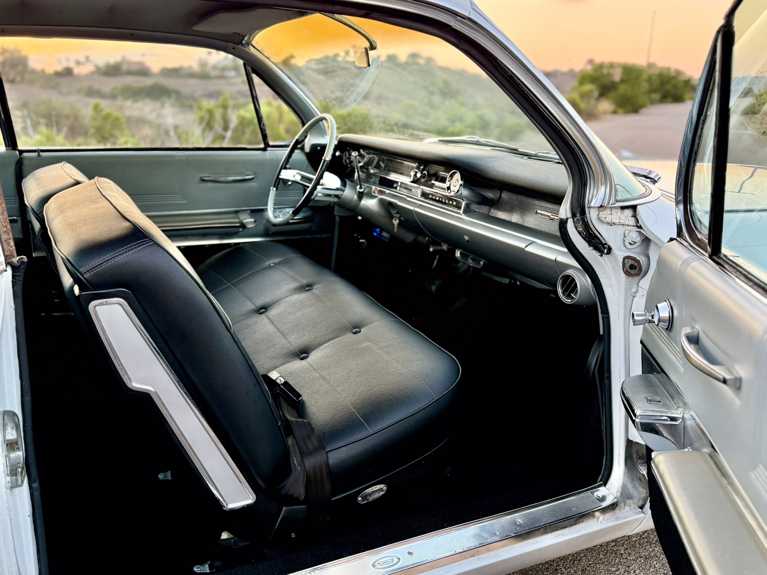 Inside, the cabin is finished in black leather with matching carpets, featuring a bench front seat and rear armrest, power windows, 6-way power seats, and factory air conditioning—luxuries few cars of the era could match. The AM/FM radio and crisp interior details evoke a true sense of 1960s sophistication.