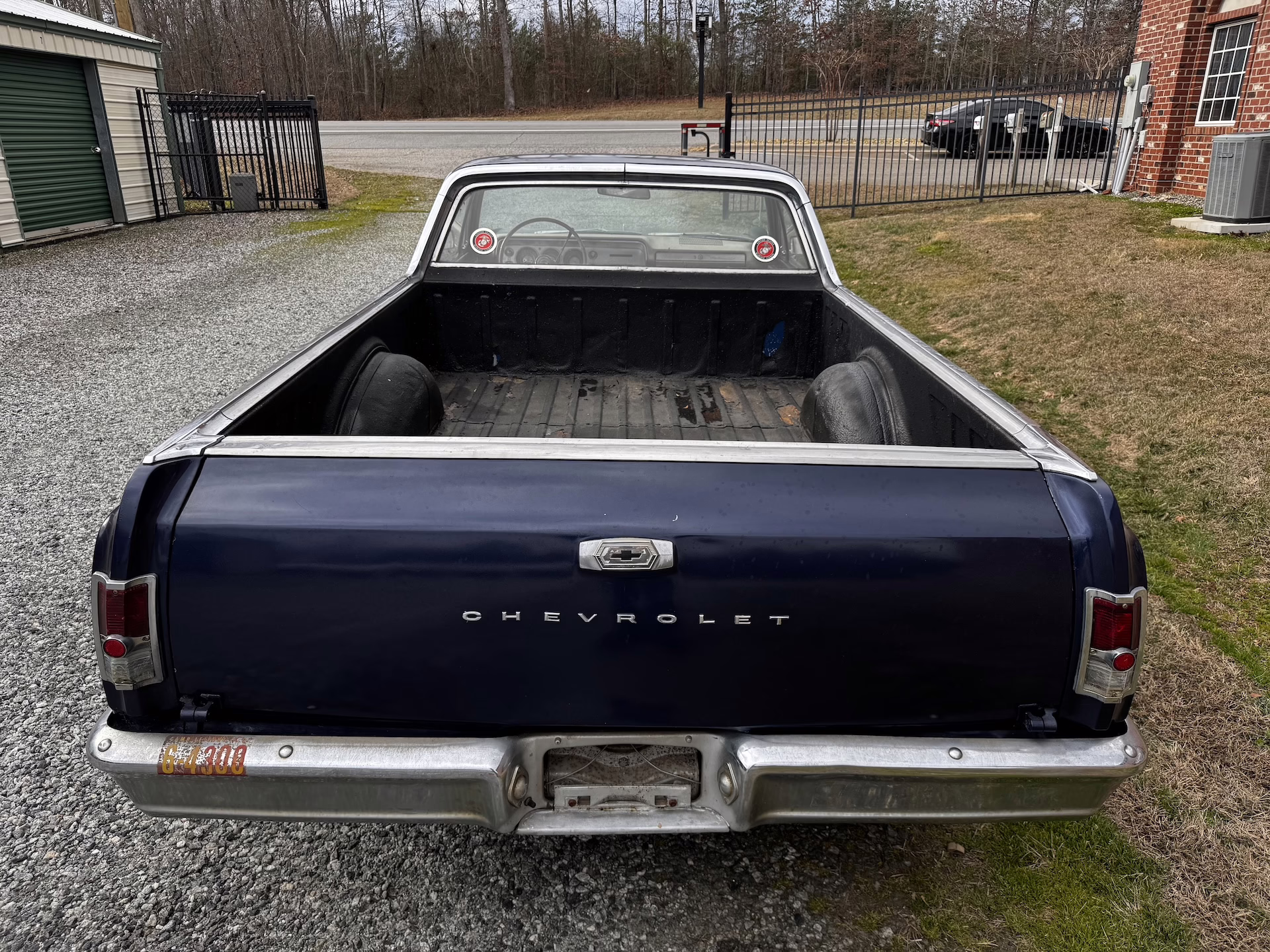 Inside, the El Camino features a light blue cloth bench seat interior, column shift, and a distinctive painted gold dash that adds a touch of vintage flair. The interior reflects its driver-quality nature but remains functional and inviting.