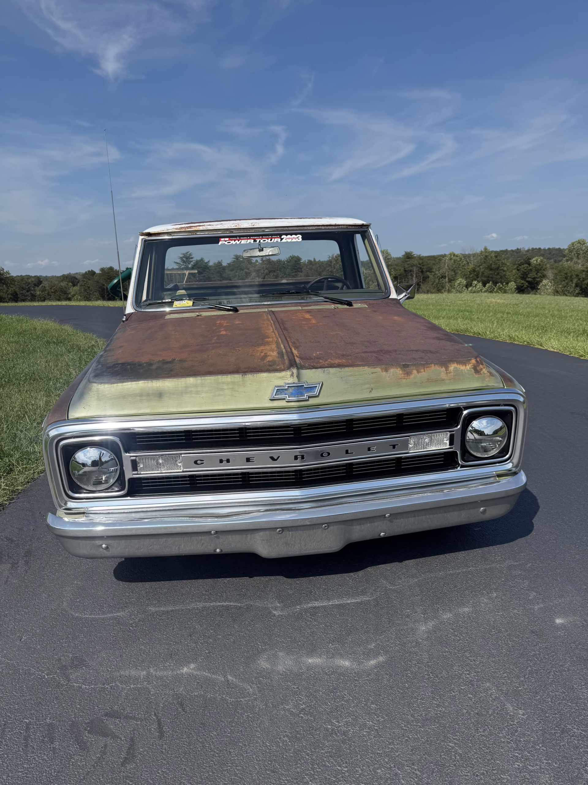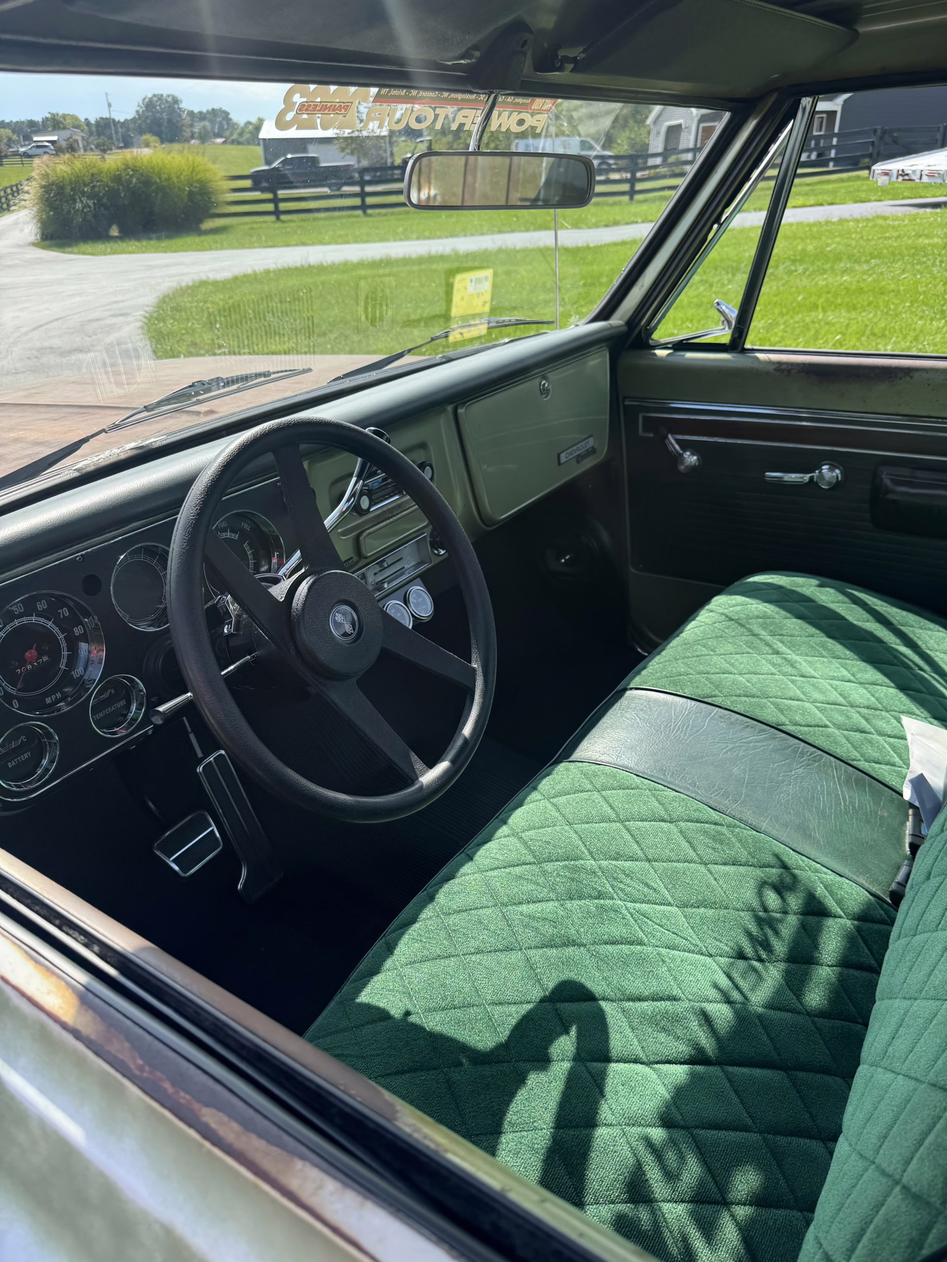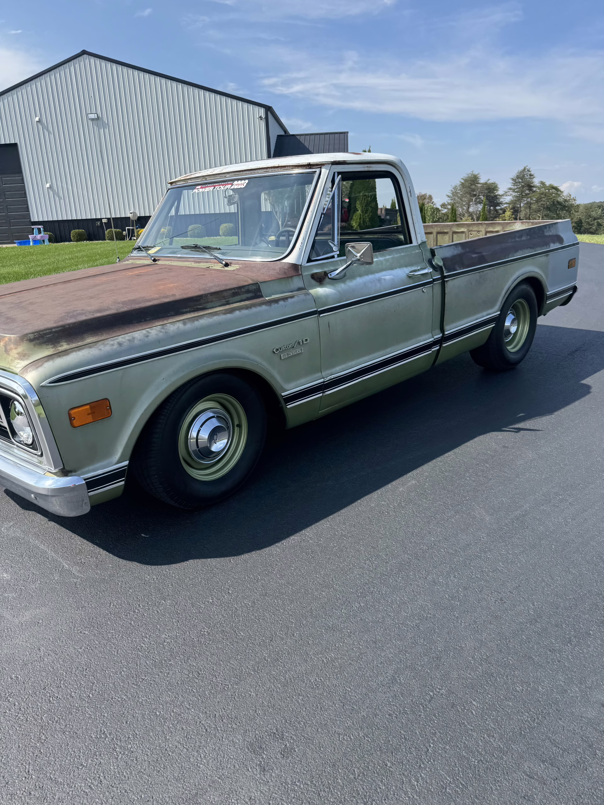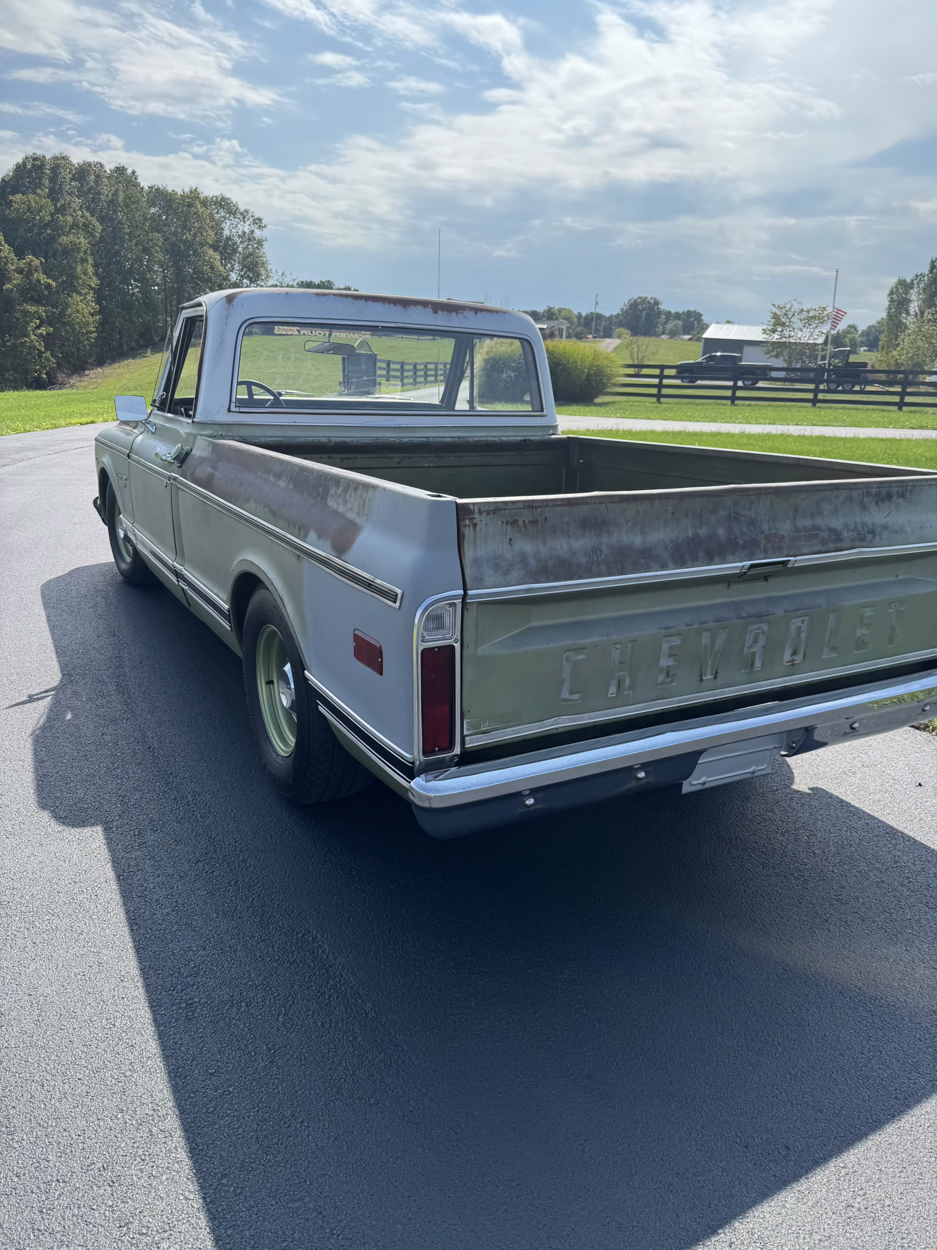 This 1970 Chevrolet C10 Pickup is the perfect blend of classic character and modern drivability. Wearing its original green paint with a naturally aged patina, accented by a contrasting white cab roof, this truck has all the right vintage vibes. The engine bay is painted to match the body, and the satin black underside gives it a clean, purposeful finish.