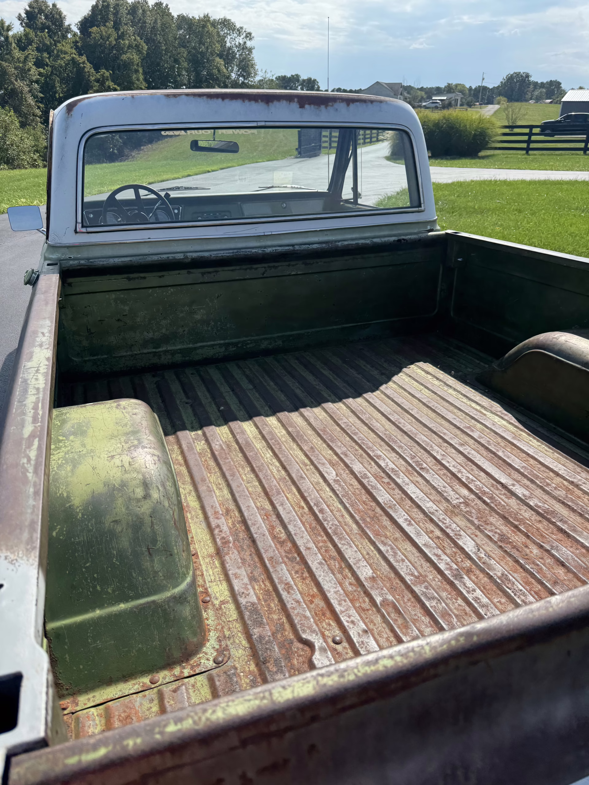 Rolling on steel wheels with classic dog dish hubcaps, this truck has an unmistakably old-school stance. Inside, the cab has been refreshed with a green cloth bench seat, nice dash and door panels, full factory gauges, and a four-spoke steering wheel that keeps it authentic and functional.