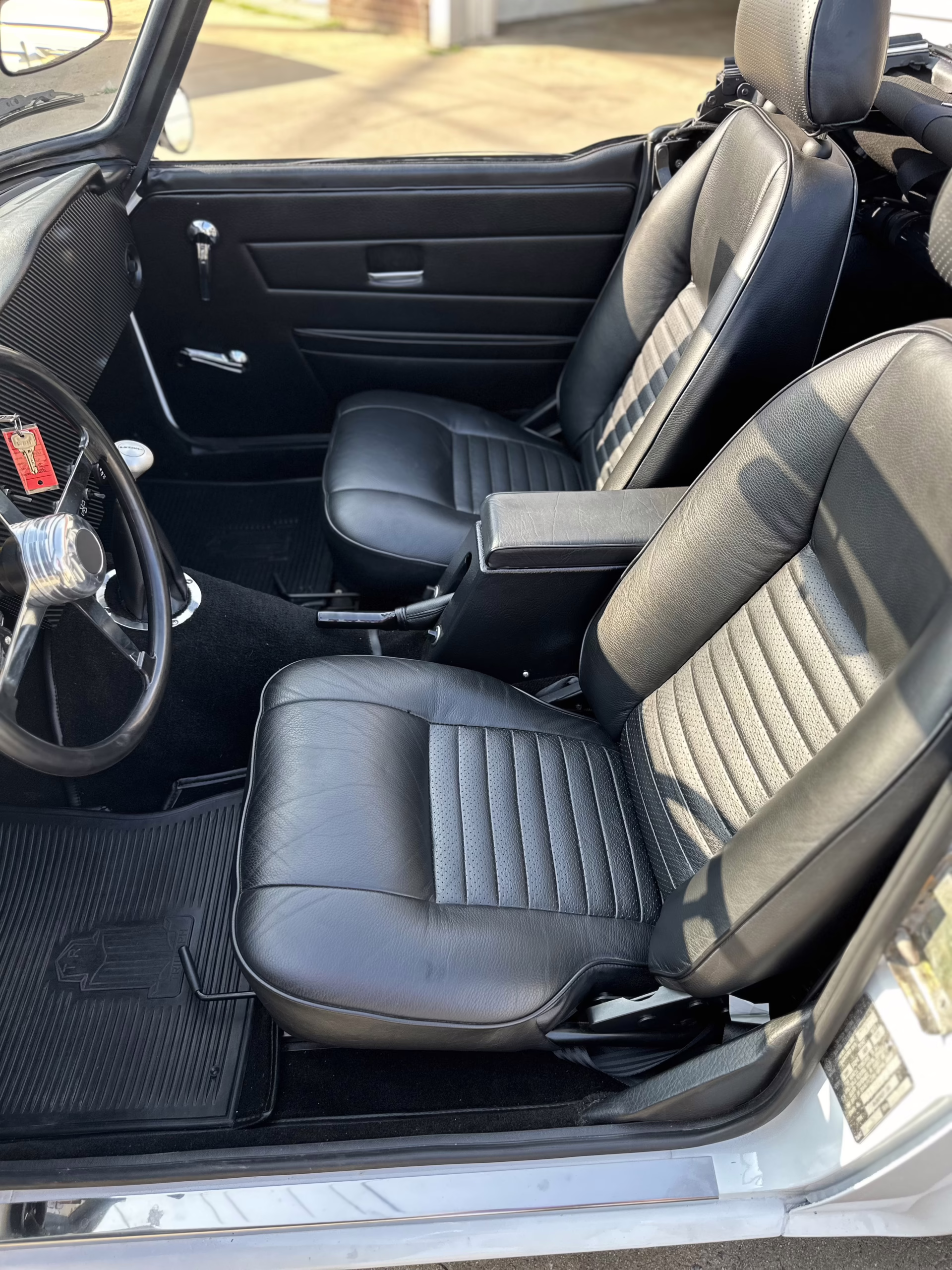 Exterior touches include a custom hood scoop, shaved bumpers, modified round taillights, fog lights, Triumph stripes, and a like-new black convertible top. Inside you’ll find black vinyl seats, custom carbon fiber dash with electronic gauges, Lokar shifter, four-spoke steering wheel, center console armrest, and a carpeted trunk.