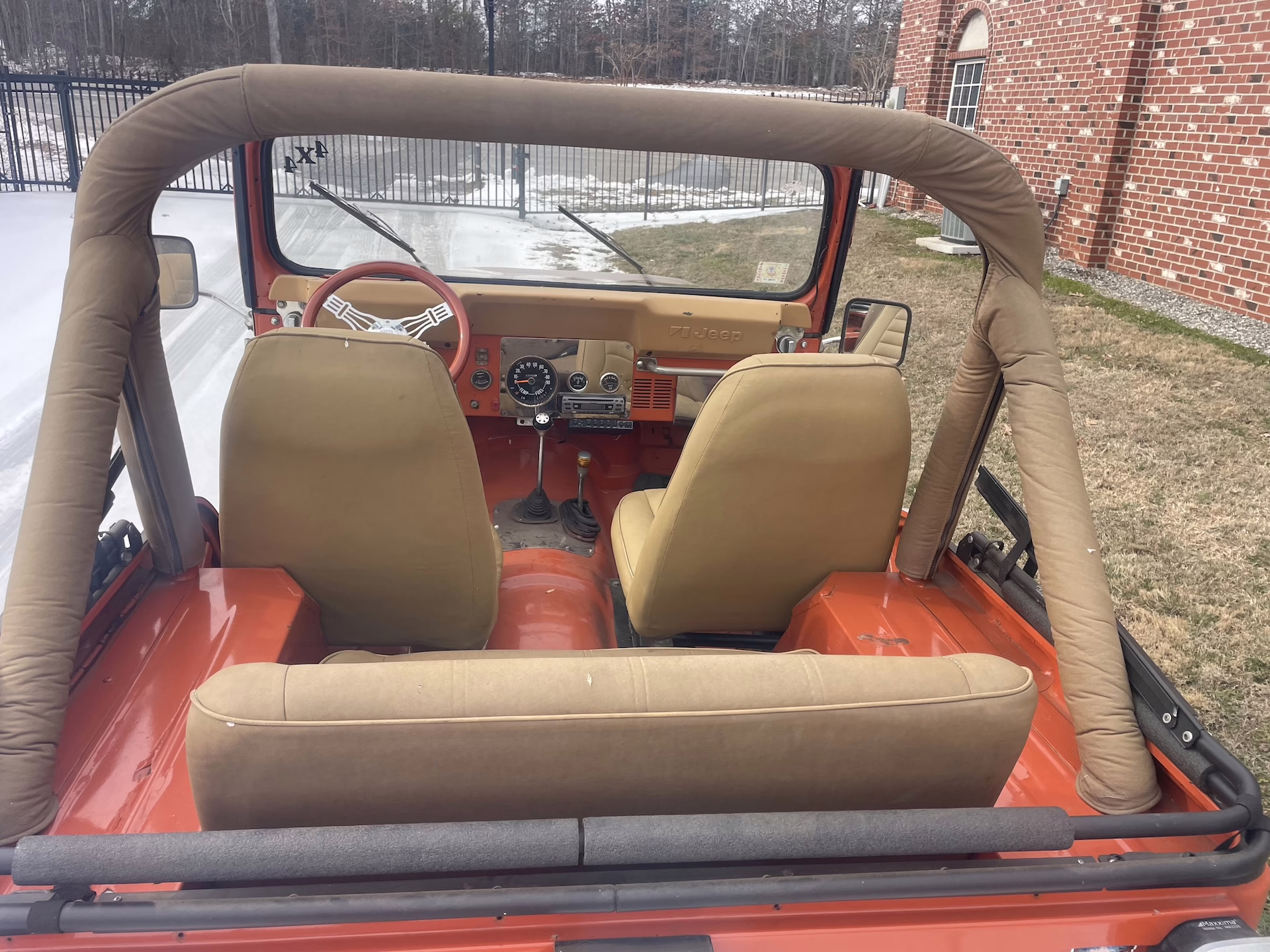 Inside, the tan interior offers vintage Jeep charm with thoughtful upgrades, including a wood steering wheel, chrome dash insert, front bucket seats, rear bench seat, and a padded roll bar for added safety and comfort.