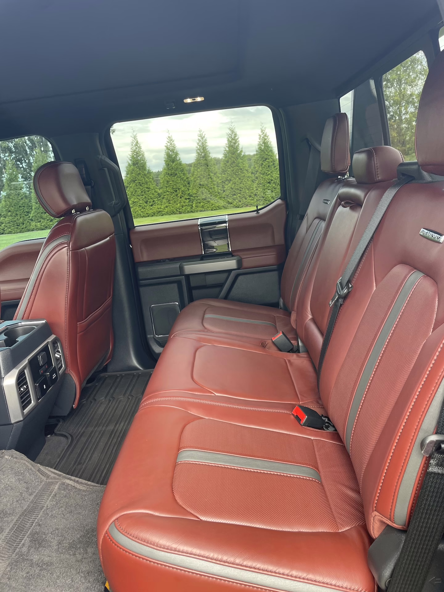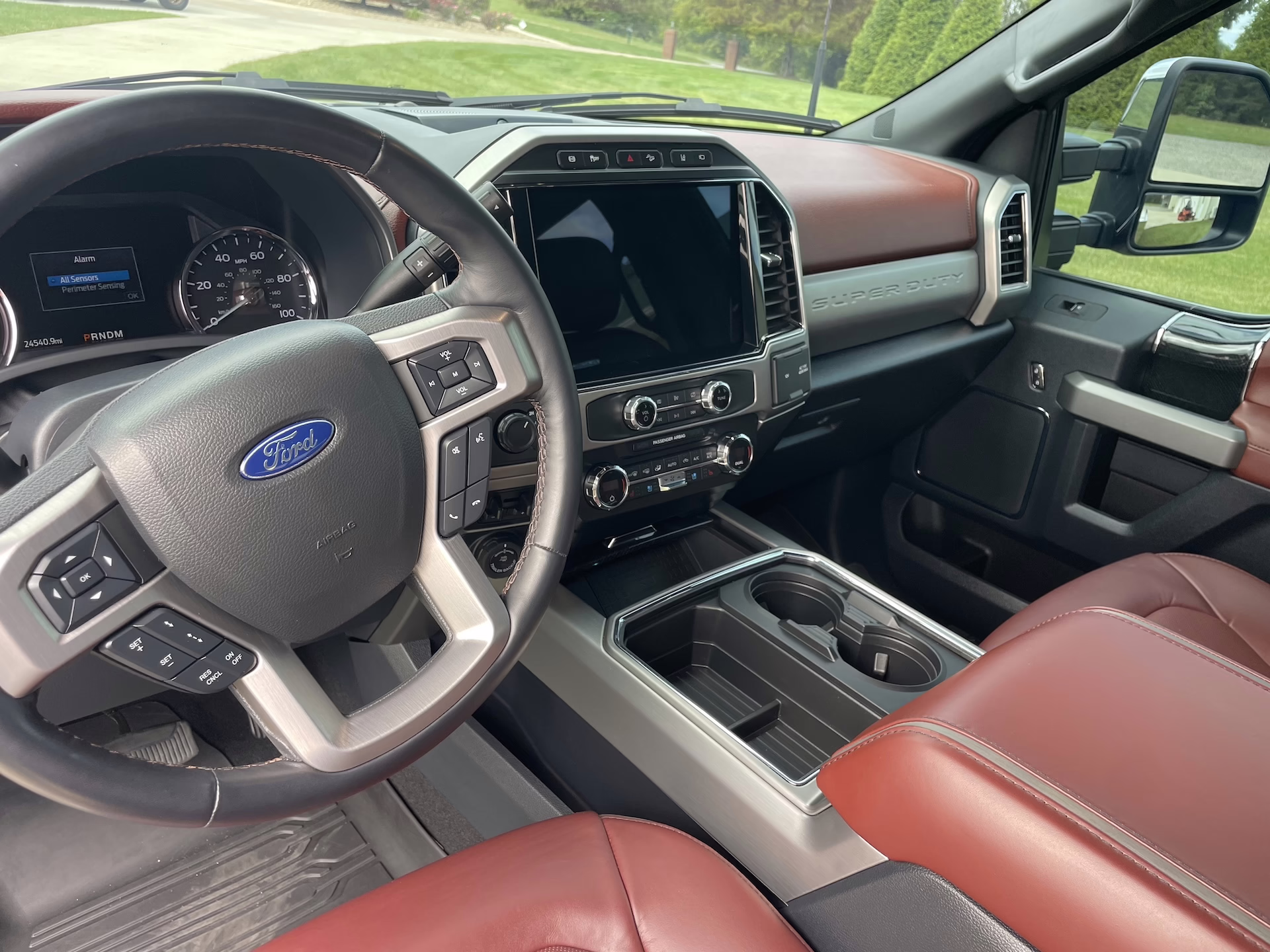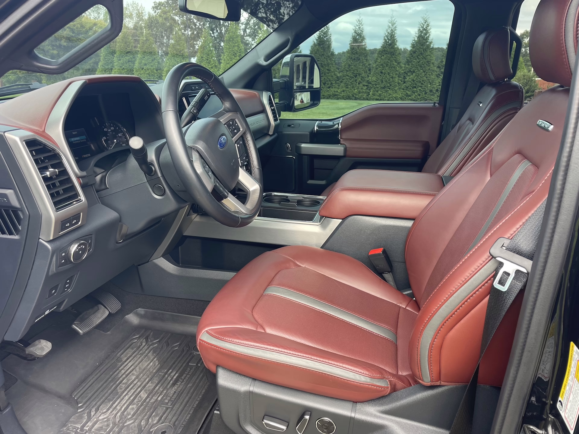 Inside, the Platinum trim provides top-tier comfort: premium leather seating, large touchscreen infotainment, B&O premium audio, adaptive cruise, blind-spot system with trailer coverage, advanced driver assists, and every luxury option you expect from Ford’s flagship Super Duty.